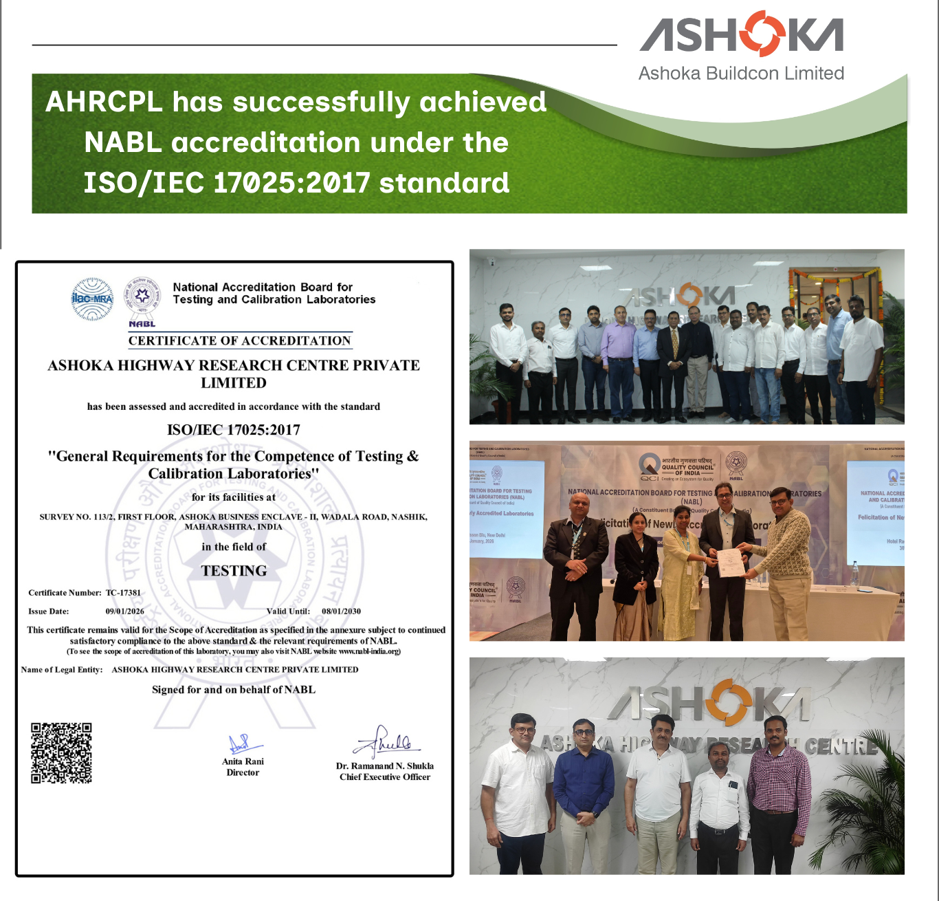 "Ashoka Highway Research Centre Private Limited, a wholly owned subsidiary of Ashoka Buildcon Limited, has been granted NABL Accreditation in accordance with ISO/IEC 17025:2017. This accreditation formally recognizes our laboratory’s technical competence, quality management systems, and compliance with internationally accepted standards for testing of road construction materials".