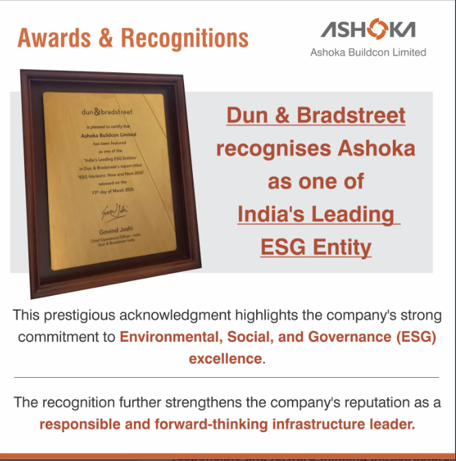 Ashoka Buildcon Limited has been honored by Dun & Bradstreet as one of “India’s Leading ESG Entities,” a recognition awarded on merit for outstanding performance.