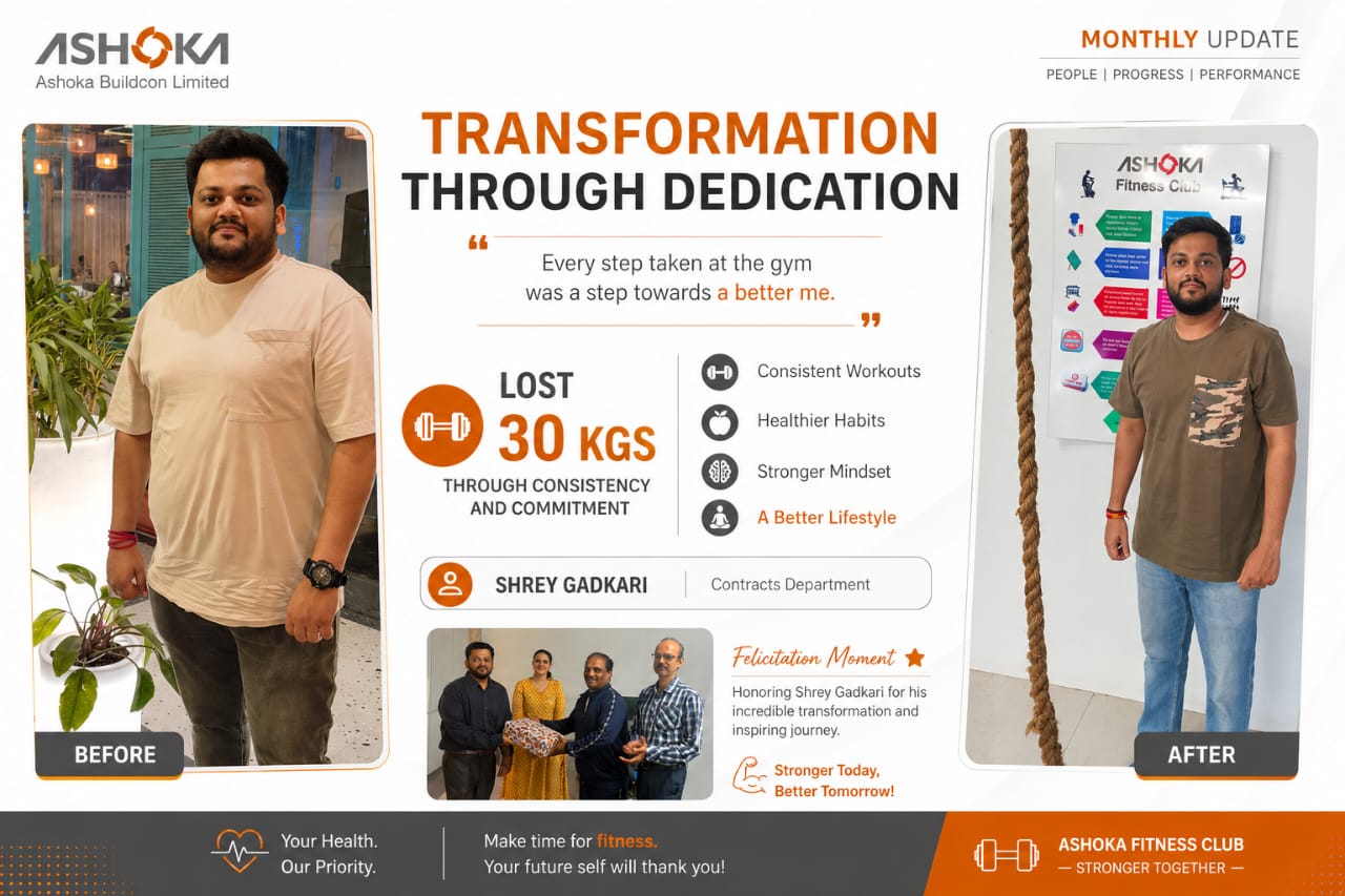 At Ashoka Buildcon Limited, the corporate fitness infrastructure is not merely a facility — it is a catalyst for life-changing personal transformation. This is powerfully demonstrated by Mr. Shrey Gadkari, a valued member of the Contracts Department at ABL's Corporate Office, who has achieved a remarkable feat of losing over 30 kilograms through sheer dedication, consistent effort, and the full utilisation of the Ashoka Fitness Club.